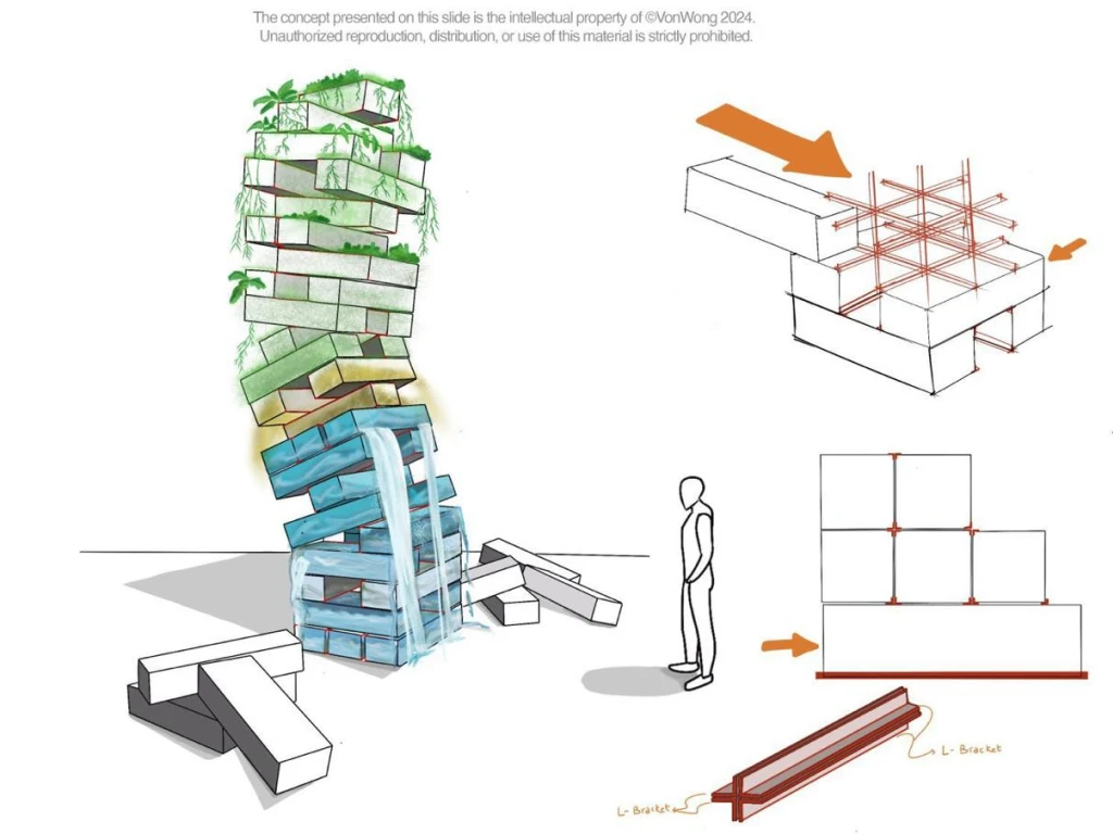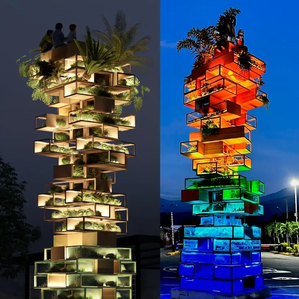 En su interior, una segunda torre viva, símbolo de la biodiversidad, respira dentro del cristal, recordándonos que el futuro debe construirse en equilibrio entre tecnología, arte y naturaleza.