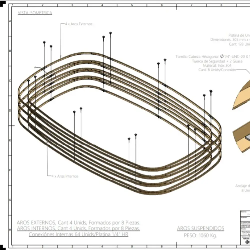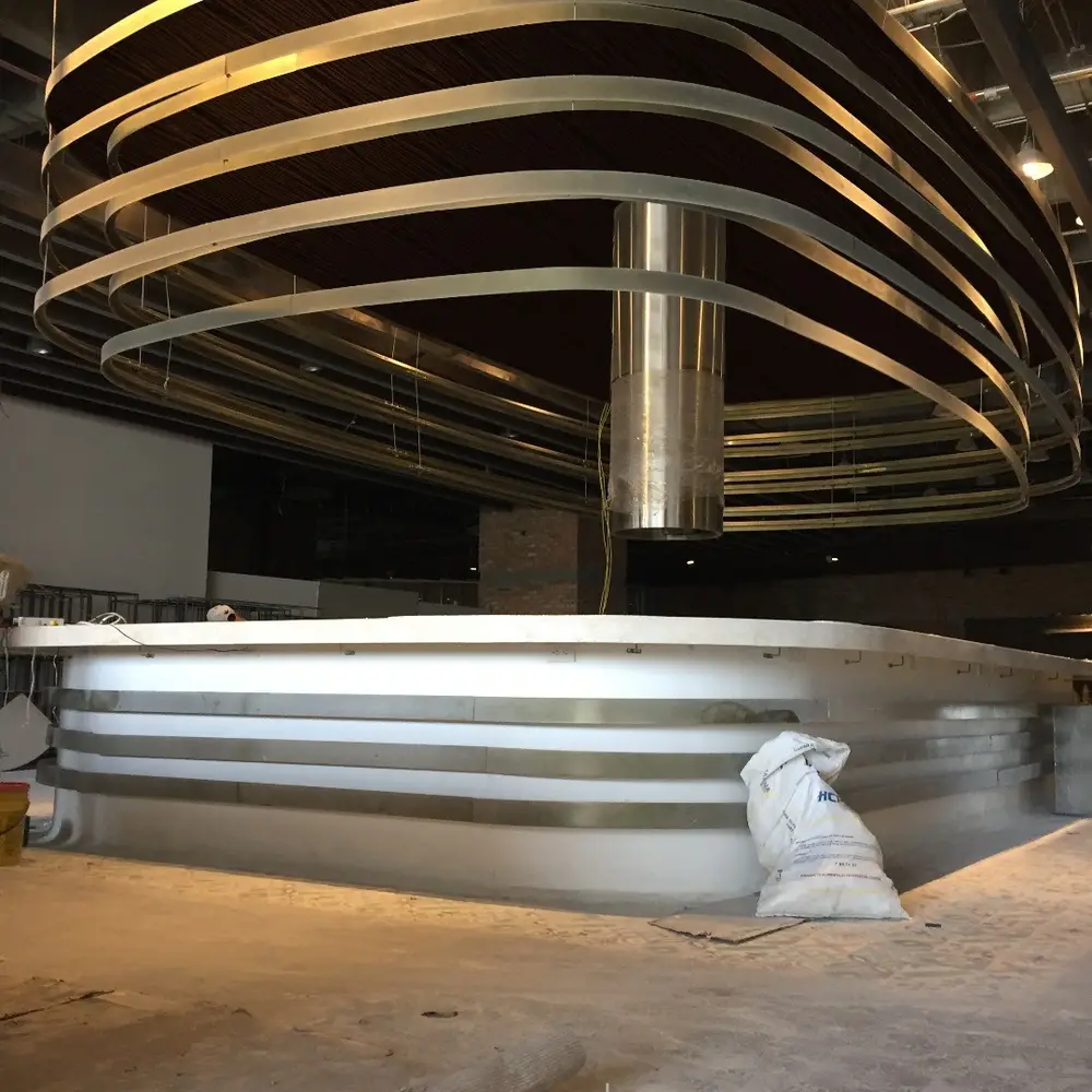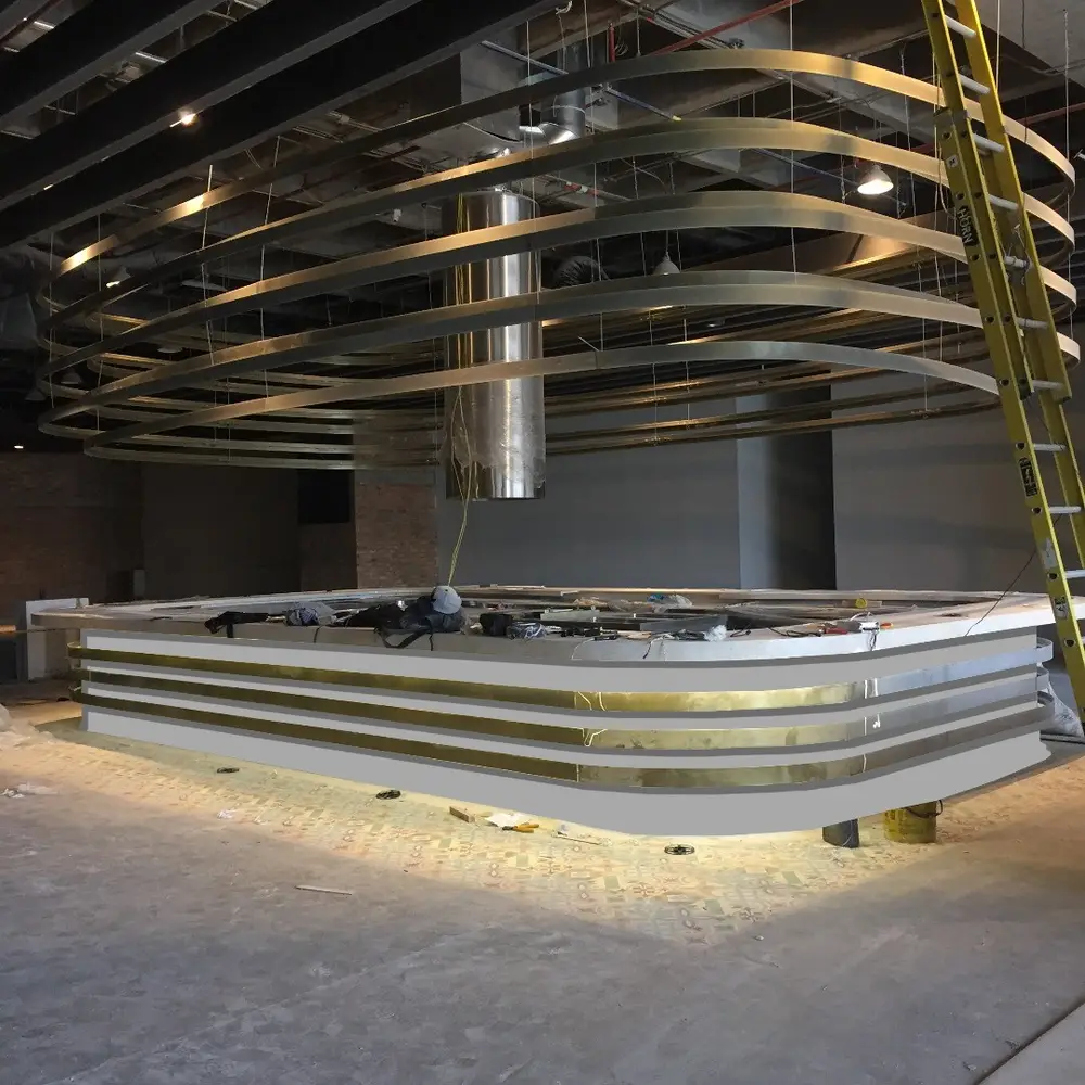 La instalación del proyecto requirió la suspensión de anillos elípticos del cielorraso de forma intercalada. Aunque el diseño se siente fresco y liviano, los anillos suspendidos en realidad pesan más de 1000 kg. El reto incluyó encontrar una solución para que el diseño arquitectónico fuera viable y se ajustara al presupuesto. Para este fin, el contorno de los anillos se logró cortando a laser las costillas de cada uno y laminando cada sección de las costillas con platina de 10cm para su ensamblaje. Posteriormente, los anillos fueron pintados electrostáticamente de color dorado.