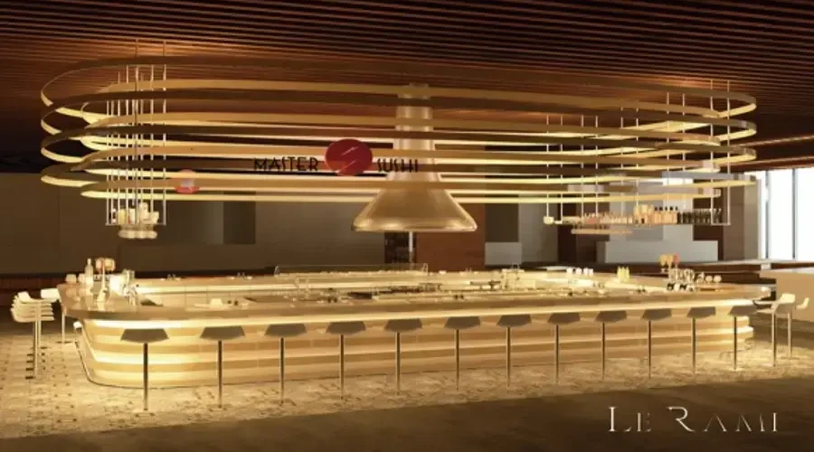 Un proyecto gratificante en el que tuvimos la oportunidad de fabricar una instalación impactante, fresca y elegante; contrastando el elemento industrial de la cocina a la vista y los anillos metálicos suspendidos, con la calidez de la iluminación y los tonos dorados del interiorismo.