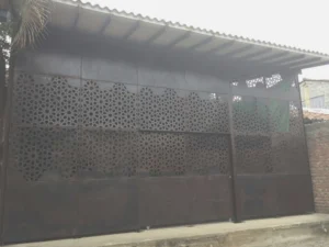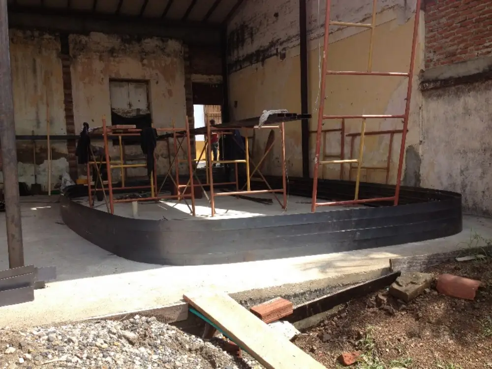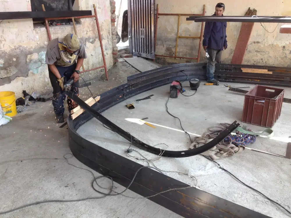 La fabricación del velo metálico se elaboró con lámina de 3mm HR con dobleces e incluyó un acabado oxidado que complementa el diseño por la calidez de sus tonos.