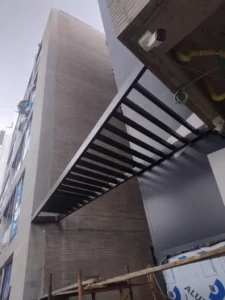 Ayudamos a nuestro cliente a diseñar, fabricar e instalar una solución arquitectónica para 2 pérgolas de vidrio, quilosuelos y revestimiento de alucobond para el hueco del ascensor de entrada principal.