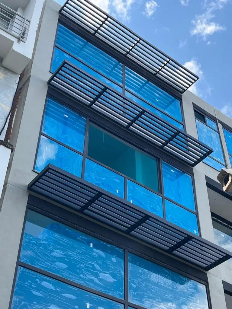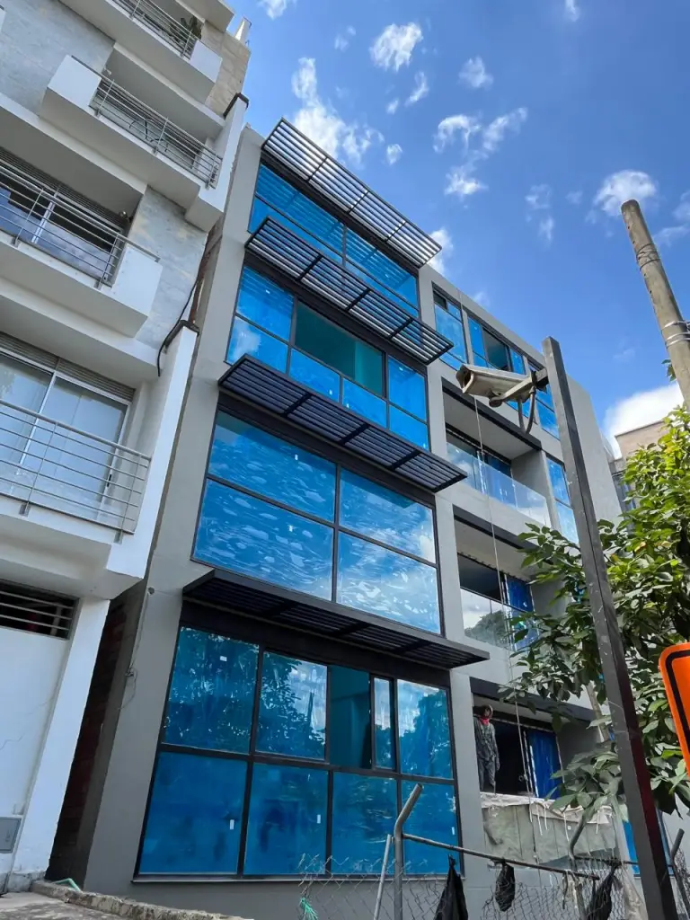 El vidrio fue fabricado por nuestros amigos de Vitelsa (@vitelsa_col) y presenta una solución de vidrio laminado con un PVB de control solar colocado entre los paneles de vidrio que agrega control solar adicional. El vidrio se instaló sobre una subestructura de aluminio para garantizar la longevidad y la adherencia.