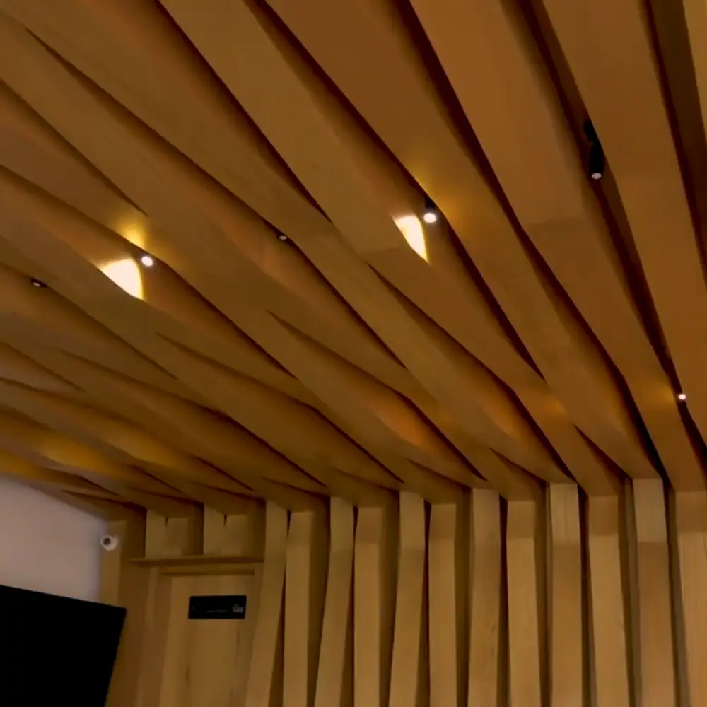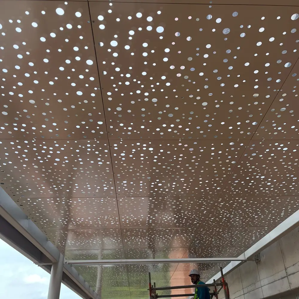Una vez sellado, nuestro equipo fabricó e instaló un cielo raso decorativo utilizando paneles de acero cortados con láser y recubiertos con pintura en polvo pintados con el pantone seleccionado por el cliente.