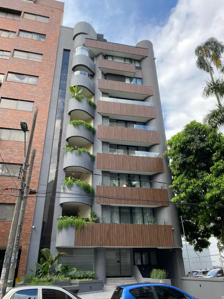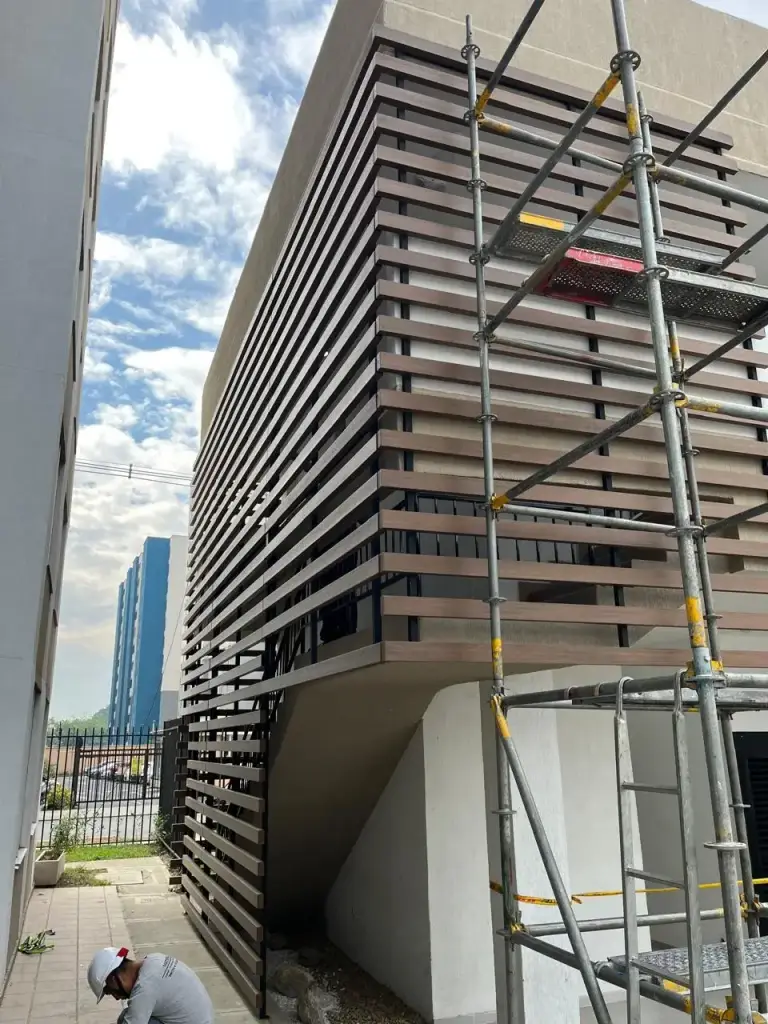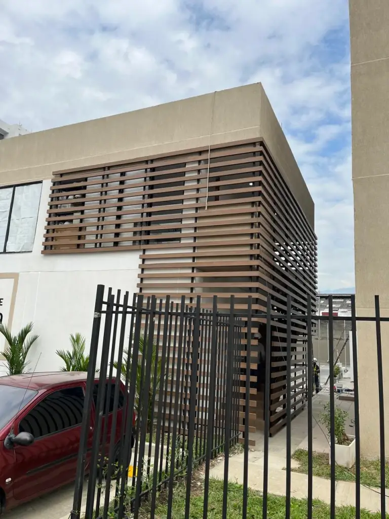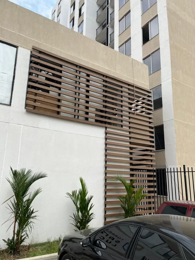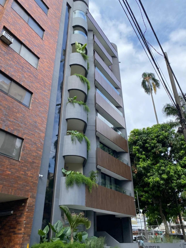 En éste caso, realizamos con mucha mesura la fachada de éste edificio ubicado en el norte de la ciudad de Cali, para ello Metamateriales utilizo un material llamado Panelex, el cual tiene alta durabilidad, es ambientalmente amigable ya que el 70% de las fibras de madera provienen de fuentes totalmente renovables, protege contra el sol y la plaga, es termo-acústico, resiste muy bien a las altas temperaturas como frío y calor extremo y su sistema de fijación flotado e independiente de la estructura principal del edificio le permite mayor control de movimiento de los planos de fachada, atendiendo las necesidades de nuestro cliente, pero también prestando atención a las condiciones climáticas del lugar y la forma de preservación en el material utilizado, para mayor durabilidad, frescura y por supuesto estética en ésta fachada.