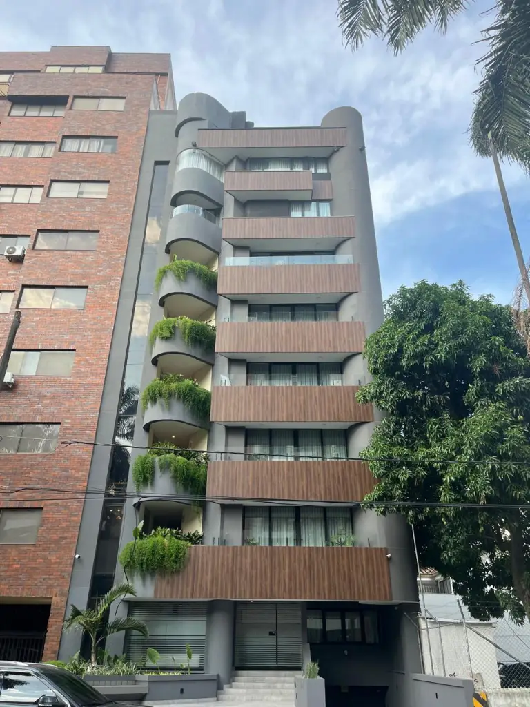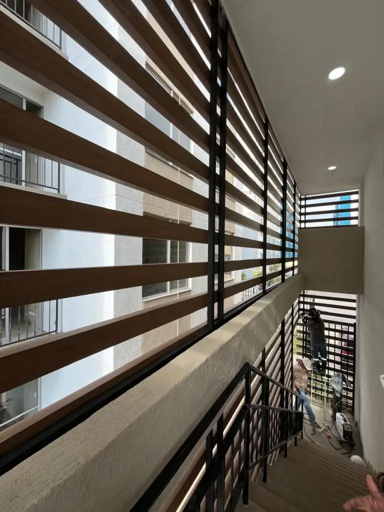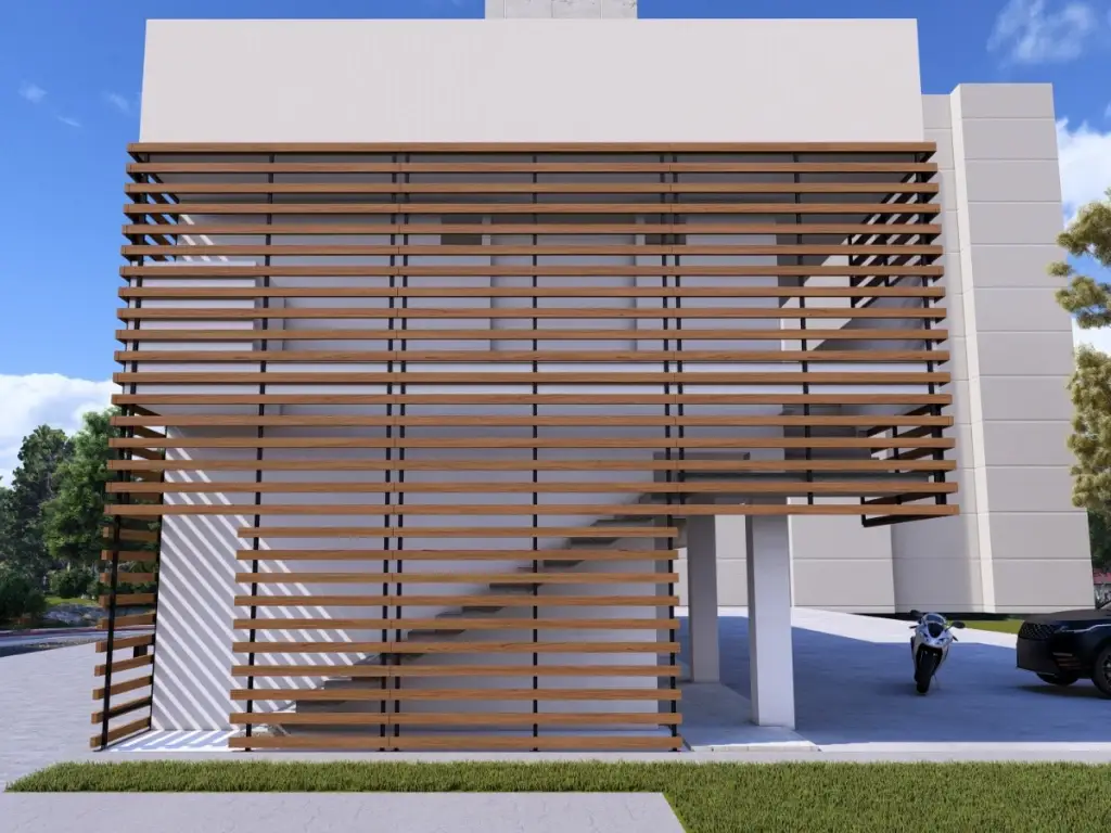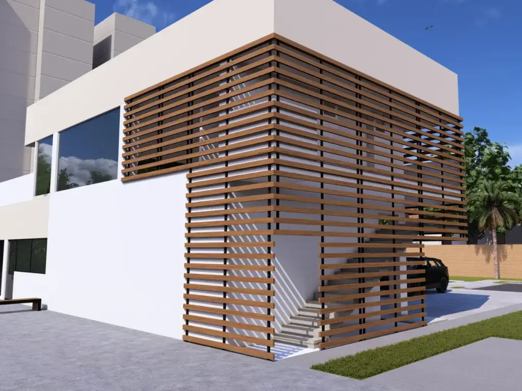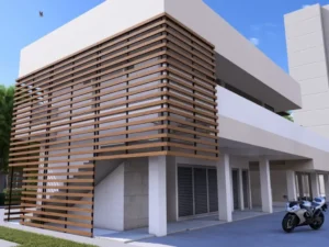 En éste caso, realizamos con mucha mesura la fachada de éste edificio ubicado en el norte de la ciudad de Cali, para ello Metamateriales utilizo un material llamado Panelex, el cual tiene alta durabilidad, es ambientalmente amigable ya que el 70% de las fibras de madera provienen de fuentes totalmente renovables, protege contra el sol y la plaga, es termo-acústico, resiste muy bien a las altas temperaturas como frío y calor extremo y su sistema de fijación flotado e independiente de la estructura principal del edificio le permite mayor control de movimiento de los planos de fachada, atendiendo las necesidades de nuestro cliente, pero también prestando atención a las condiciones climáticas del lugar y la forma de preservación en el material utilizado, para mayor durabilidad, frescura y por supuesto estética en ésta fachada.