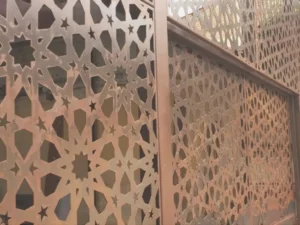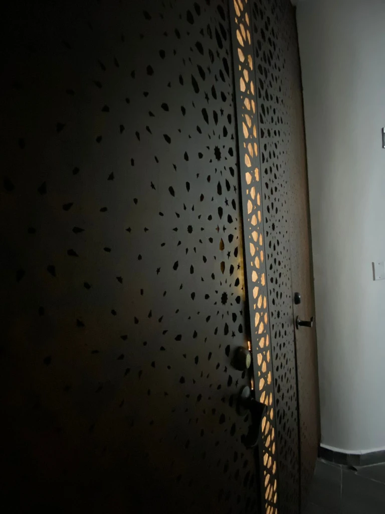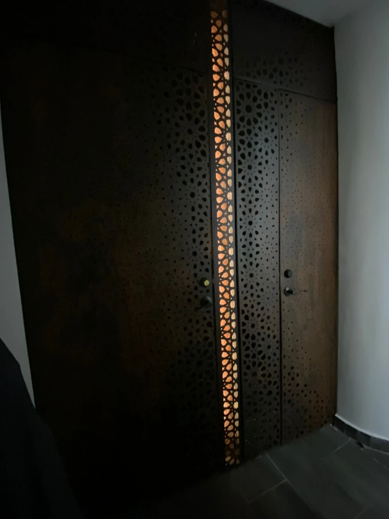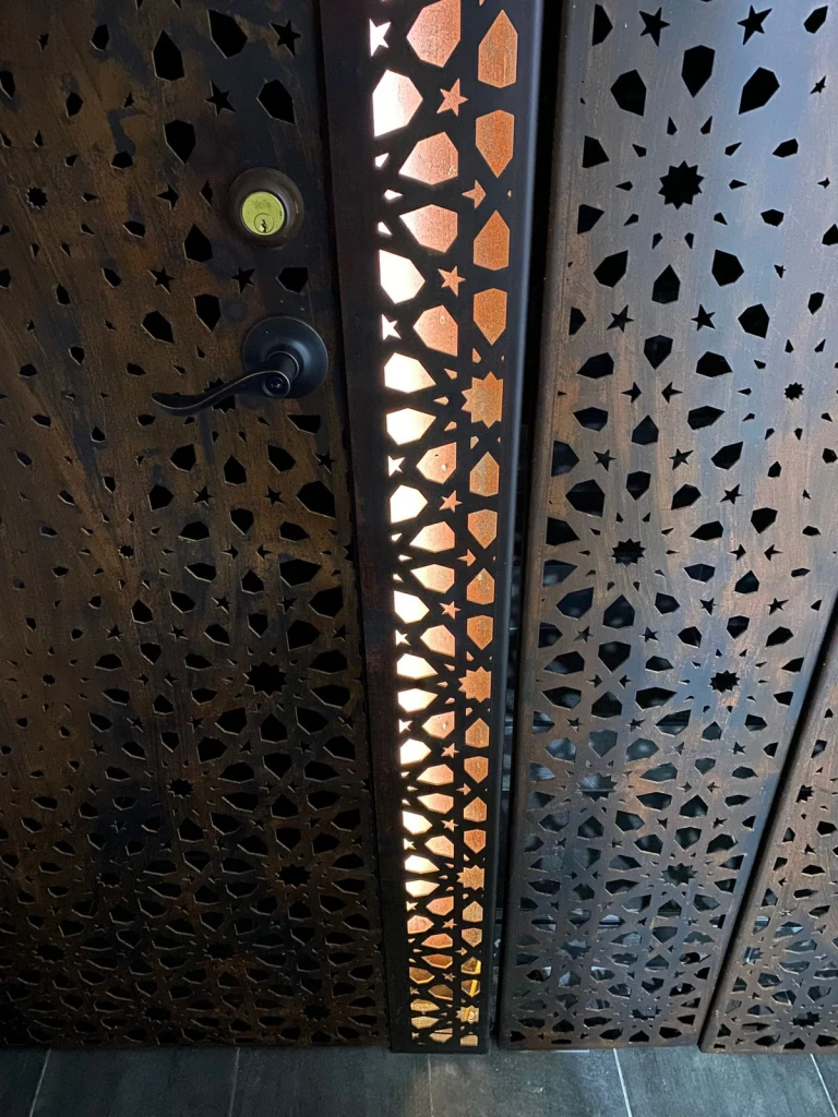 El velo metálico fue inspirado en los patrones geométricos característicos del diseño arábigo, los cuales suelen construirse a partir de composiciones complejas de círculos y cuadrados que se repiten, superponen y entrelazan. Estos patrones intrincados y repetitivos generan teselados matemáticos infinitos que le brindan al espacio un carácter artístico sugestivo y llamativo; el cual se acentúa con la iluminación y las sombras creadas sobre las paredes adyacentes.