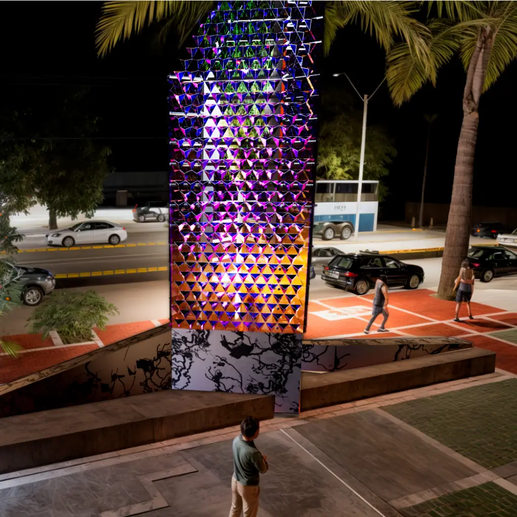 Nuestra propuesta es una torre de cristal de casi 9 metros, de formas fractales y acabado iridiscente, que cambia con la luz del día. La base, revestida en piedra local, honra nuestros siete ríos, iluminados con tecnología y realidad mixta.